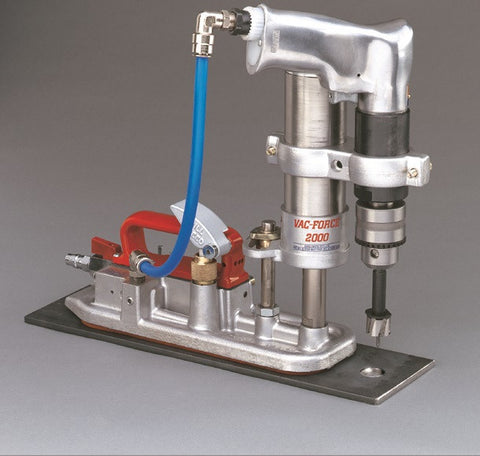This vacuum based portable drill press gives users the holding power of a magnetic drill press with the flexibility to use it on non-ferrous surfaces. The drill motor carriage puts consistent pressure on the cutting tooth, extending the life of the cutters and decreasing drill time. The easy to use air pressure button releases the vacuum to reposition the unit quickly. The tear drop control allows the cutter to easily reach corners. The Vac-Force requires 100 to 120 psi of compressed air to operate, including air needed for most air drill motors. Modified with feed stop (Drill motor sold seperately).